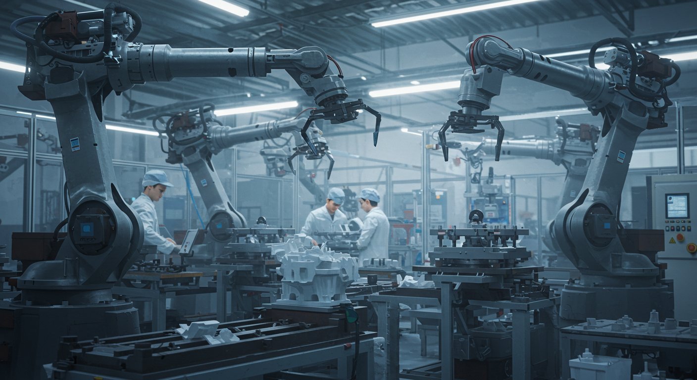 На фото: роботизированная линия литья пластика, обеспечивающая точность и эффективность производства.